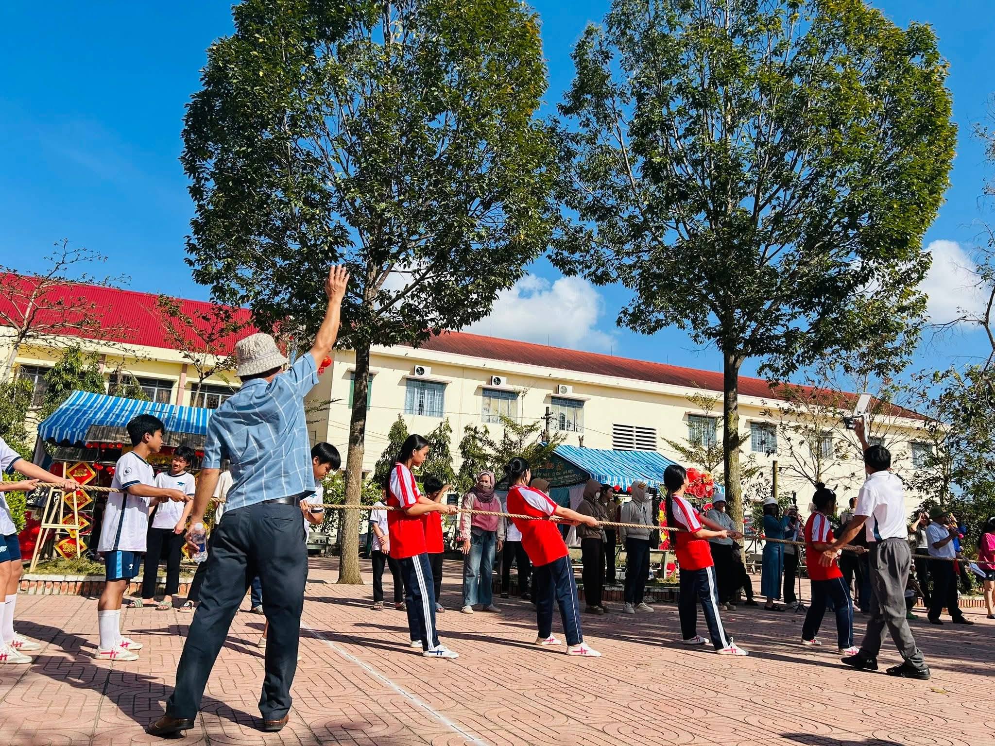 Các trò chơi dân gian như kéo co, nhảy bao bố, đi cà kheo… diễn ra sôi nổi với sự tham gia cổ vũ nhiệt tình của thầy cô và phụ huynh. Những tiếng cười giòn tan đã tạo nên không khí vui tươi, phấn khởi cho ngày hội.