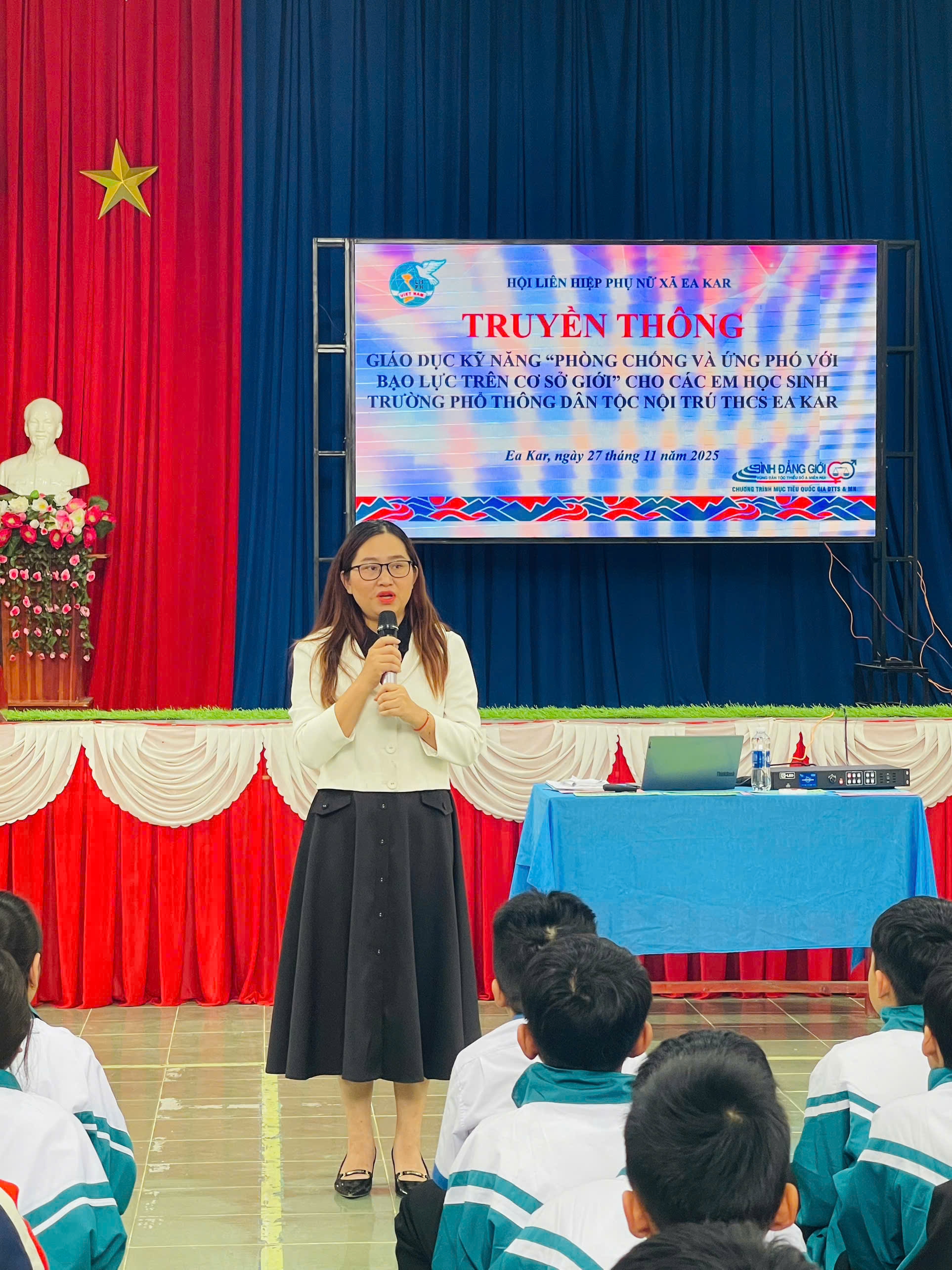 Thực hiện Kế hoạch số 95 ngày 24 tháng 11 năm 2025 của Phòng Văn hóa xã hội xã Ea Kar, chiều ngày 27/11/2025, Hội Liên hiệp Phụ nữ xã Ea Kar phối hợp với Công ty Kỹ năng sống Thành Nhân đã tổ chức buổi tuyên truyền tại Trường Phổ thông Dân tộc Nội trú Ea Kar với nội dung trọng tâm về bình đẳng giới và phòng ngừa, ứng phó với bạo lực trên cơ sở giới.